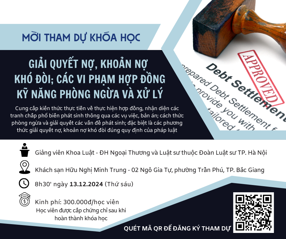 Mời tham dự Khóa học ““Giải quyết nợ, khoản nợ khó đòi; các vi phạm hợp đồng Kỹ năng phòng ngừa và xử lý”