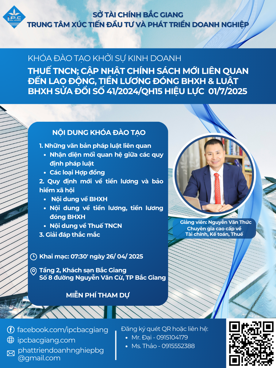 Nhằm hỗ trợ doanh nghiệp nhỏ và vừa trên địa bàn tỉnh Bắc Giang cập nhật kịp thời những thay đổi về chính sách lao động, tiền lương, bảo hiểm xã hội và thuế thu nhập cá nhân, ngày 26/4/2025, Trung tâm Xúc tiến đầu tư và Phát triển doanh nghiệp – Sở Tài chính...