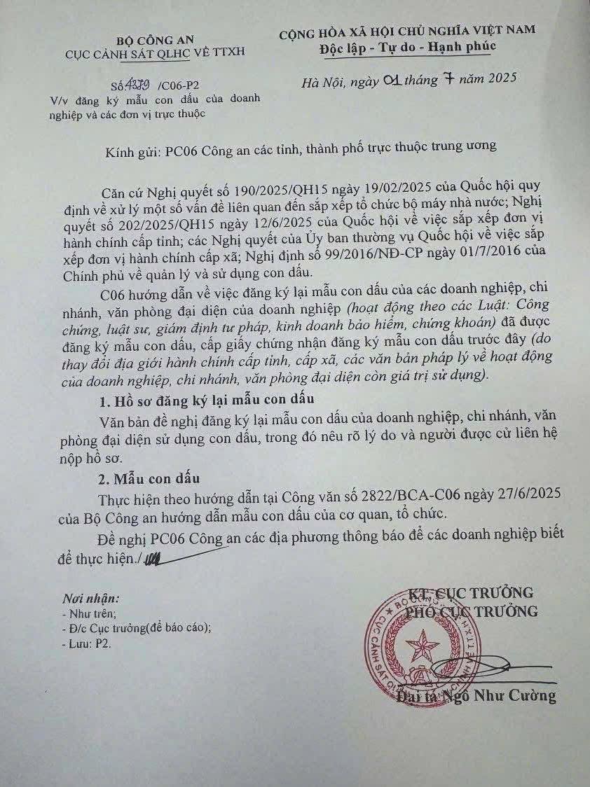 THÔNG BÁO ĐẾN CÁC DOANH NGHIỆP VỀ VIỆC ĐĂNG KÝ MẪU CON DẤU (Công văn số 4320/C06-P2 ngày 01/7/2025 của Cục Cảnh sát Quản lý hành chính về trật tự xã hội – Bộ Công an) Căn cứ Nghị quyết số 190/2025/QH15 ngày 19/02/2025 và Nghị quyết số 202/2025/QH15 ngày 12/6/2025 của Quốc...