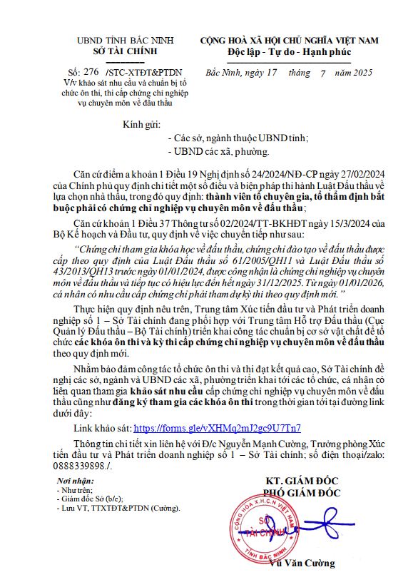 Khảo sát nhu cầu và chuẩn bị tổ chức ôn thi, thi cấp chứng chỉ nghiệp vụ chuyên môn về đấu thầu